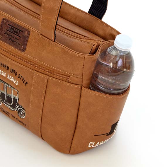 両サイドのポケットには、ペットボトルやスマホ、定期なども入りとても便利です。上部にはメインファスナーを装着して中の物も見えにくく、外側と内側にはポケットがあり収納力も抜群で小分けにも便利です。